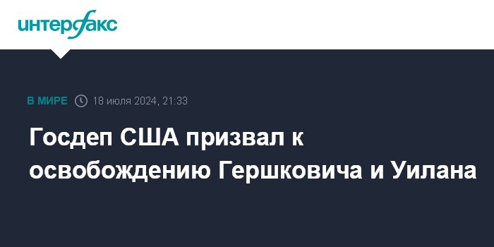 Москва. 18 июля. INTERFAX.RU - Власти США настаивают, что задержанного в РФ и обвиняемого в шпионаже журналиста The Wall Street Journal Эвана Гершковича, а также отбывающего наказание Пола Уилана нужно незамедлительно отпустить на свободу, заявил в четверг представитель Госдепартамента Ведант Патель.
