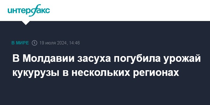 Москва. 19 июля. INTERFAX.RU - В южный районах Молдавии урожай кукурузы в южных районах Молдавии пострадал от засухи на 70-100%, подсолнечника - на 60-80%, сообщило издание Rupor со ссылкой на выводы ученых из Национального центра исследований и производства сортовых семян и Института почвоведения, агрохимии и защиты почвы.