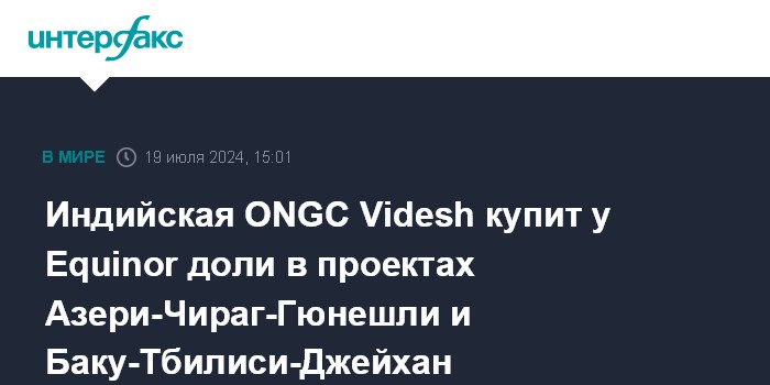 Москва. 19 июля. INTERFAX.RU - Индийская компания ONGC Videsh Limited подписала с норвежской Equinor окончательное соглашение о купле-продаже 0,615% долевого участия в проекте Азери-Чираг-Гюнешли и приобретении 0,737% акций в трубопроводной компании BTC Co, являющейся оператором нефтепровода Баку-Тбилиси-Джейхан (БТД). Об этом говорится в официальном сообщении индийской компании.