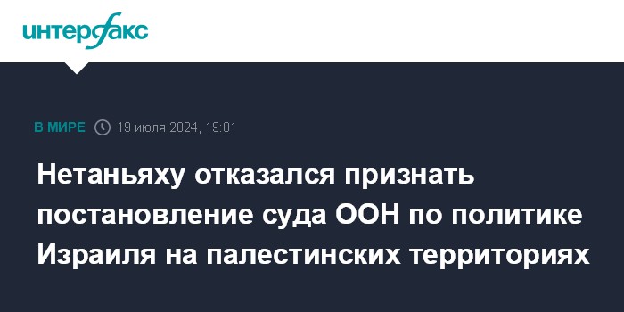 Москва. 19 июля. INTERFAX.RU - Премьер-министр Израиля Биньямин Нетаньяху в пятницу отверг вердикт Международного суда ООН, согласно которому израильское присутствие на палестинских территориях не является законным.