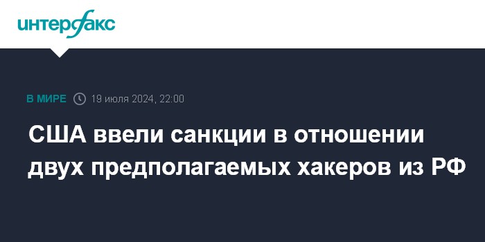 Москва. 19 июля. INTERFAX.RU - США в пятницу включили в санкционные списки двух россиян, которые, по мнению Вашингтона, имеют отношение к хакерской деятельности против значимых элементов американской инфраструктуры.