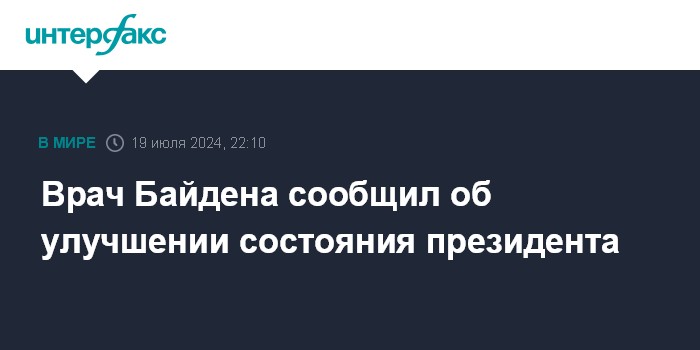 Москва. 19 июля. INTERFAX.RU - Состояние президента США Джо Байдена, продолжающего лечение от COVID-19, улучшается, говорится в сообщении, распространенном в пятницу его лечащим врачом Кевином О'Коннором.