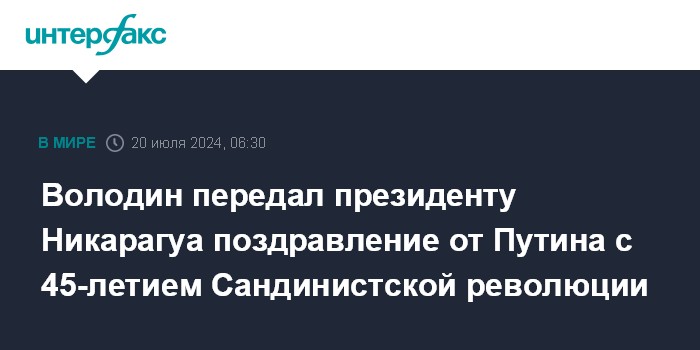 Спикер Думы по поручению Путина поздравил "весь свободный, мужественный народ Никарагуа с праздником".