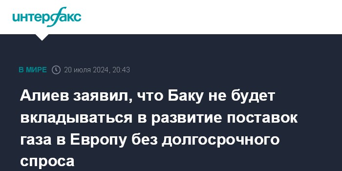 Москва. 20 июля. INTERFAX.RU - Азербайджан не будет вкладывать миллиарды долларов в увеличение добычи газа и расширение инфраструктуры его экспорта, если ЕС не готов его покупать на долгосрочной основе, заявил президент страны Ильхам Алиев.