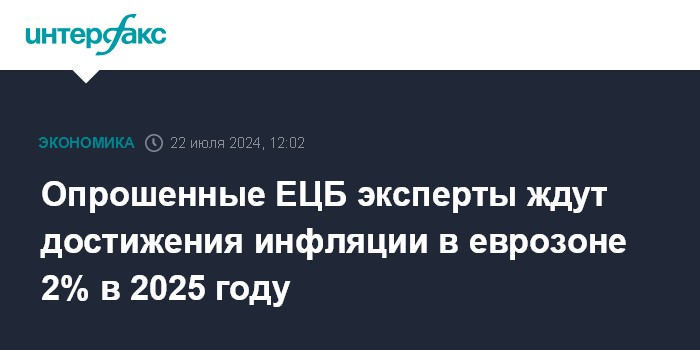 Москва. 22 июля. INTERFAX.RU - Инфляция в еврозоне достигнет целевых 2% в 2025 году, показал квартальный опрос аналитиков, проведенный Европейским центральным банком.