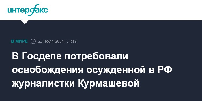 Москва. 22 июля. INTERFAX.RU - Администрация США работает над делом имеющей российское и американское гражданство журналистки Алсу Курмашевой, которая осуждена в России по делу о фейках, сообщили в понедельник в Госдепе.