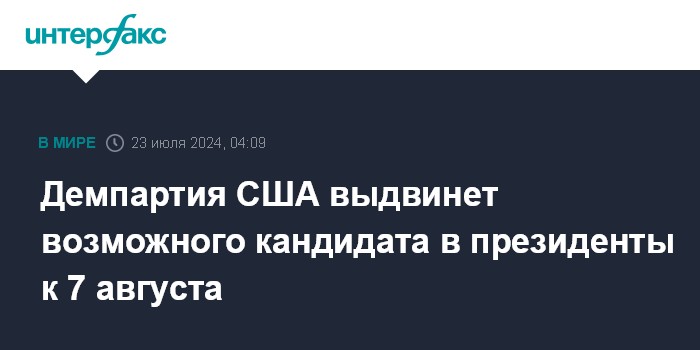 Москва. 23 июля. INTERFAX.RU - Национальный комитет Демократической партии (DNC) США объявил в понедельник, что планирует выдвинуть кандидата в президенты к 7 августа, сообщило издание The Hill.