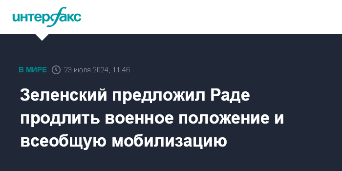 Москва. 23 июля. INTERFAX.RU - Президент Украины Владимир Зеленский предлагает Верховной раде продлить срок действия военного положения и проведения всеобщей мобилизации на 90 дней с 12 августа.