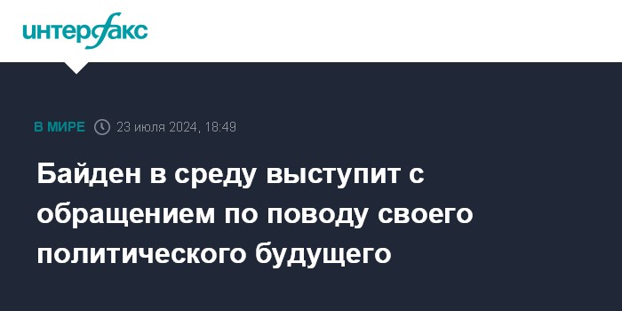 Москва. 23 июля. INTERFAX.RU - Президент США Джо Байден в среду, 24 июля, выступит с обращением, в котором объяснит, почему принял решение покинуть президентскую гонку, а также изложит планы на будущее.