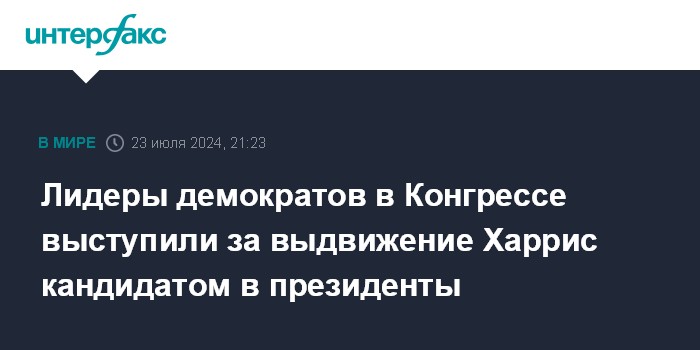 Москва. 23 июля. INTERFAX.RU - Лидеры конгрессменов-демократов из обеих палат Конгресса США, Чак Шумер и Хаким Джеффрис, поддержали во вторник идею выдвижения Камалы Харрис кандидатом в президенты от их партии.