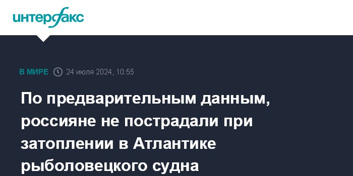 Москва. 24 июля. INTERFAX.RU - По предварительной информации, россияне, находившиеся на борту затонувшего в Атлантическом океане рыболовецкого судна Argos Georgia, не пострадали, сообщили в среду в МИД России.