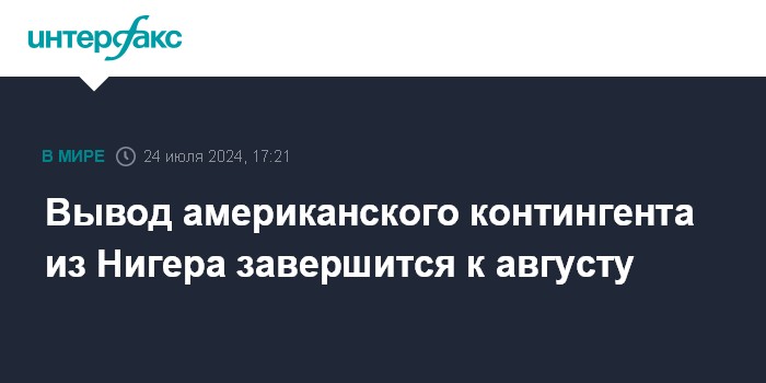 Москва. 24 июля. INTERFAX.RU - Вывод американских военнослужащих из Нигера будет завершен к началу августа, сообщил представитель Африканского командования ВС США Кеннет Экман. Об этом сообщают западные СМИ.