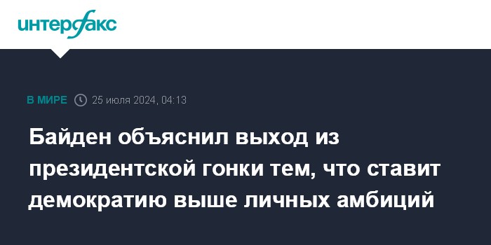 Москва. 25 июля. INTERFAX.RU - Президент США Джо Байден заявил, что принял решение прекратить борьбу за переизбрание в связи с тем, что считает демократию в стране важнее личных амбиций.
