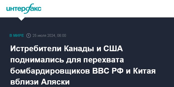 Москва. 25 июля. INTERFAX.RU - Канадские и американские истребители были направлены на перехват четырех бомбардировщиков ВВС России и Китая, которые были обнаружены в воздушном пространстве у побережья Аляски, сообщило Объединенное командование аэрокосмической обороны Северной Америки (NORAD).