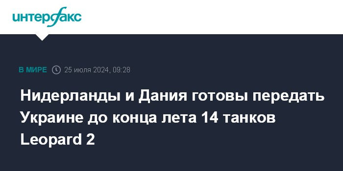 Москва. 25 июля. INTERFAX.RU - Нидерланды и Дания собираются направить Украине до конца лета 14 танков Leopard 2, сообщают в западные СМИ со ссылкой на заявление нидерландского Минобороны.