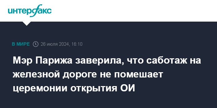 Москва. 26 июля. INTERFAX.RU - Нарушение движения скоростных поездов во Франции из-за актов саботажа против железнодорожного транспорта никак не отразится на проведении церемонии открытия Олимпийских игр в Париже, заявила мэр французской столицы Анн Идальго.