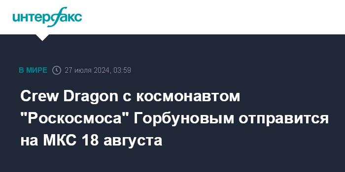Crew Dragon с космонавтом "Роскосмоса" Горбуновым отправится на МКС 18 августа