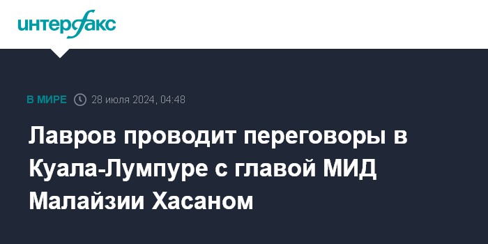 Москва. 28 июля. INTERFAX.RU - Главы МИД РФ и Малайзии Сергей Лавров и Мохамад Хасан проводят переговоры в Куала-Лумпуре.