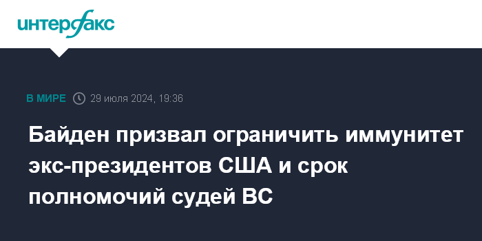 Москва. 29 июля. INTERFAX.RU - Президент США Джо Байден в статье для The Washington Post предложил ограничить иммунитет бывших президентов страны, срок полномочий судей Верховного суда и ввести обязательный для исполнения кодекс этики Верховного суда.