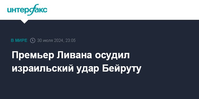 Москва. 30 июля. INTERFAX.RU - Глава ливанского правительства Наджиб Микати во вторник осудил израильский удар по южной части Бейрута, который он назвал вопиющей агрессией.