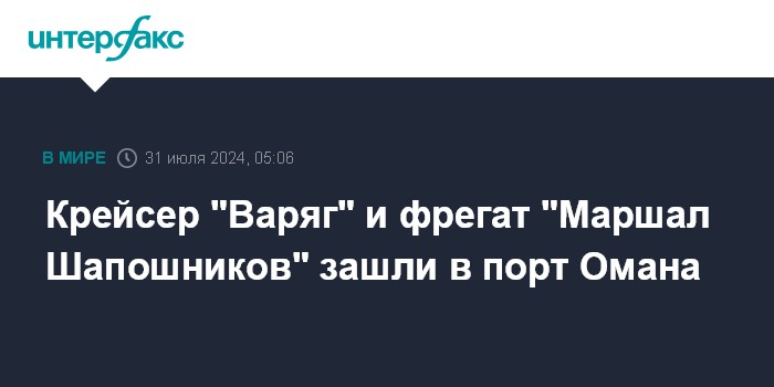 "Отряд боевых кораблей Тихоокеанского флота в составе гвардейского ордена Нахимова ракетного крейсера (ГРКР) "Варяг" и фрегата "Маршал Шапошников" прибыли с деловым заходом в порт Салала Султаната Оман в Аравийском море", - сказано в сообщении.