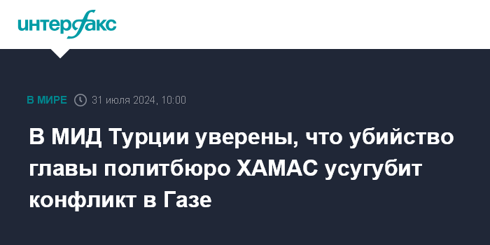 Москва. 31 июля. INTERFAX.RU - Анкара осуждает убийство главы политбюро движения ХАМАС Исмаила Хании, которое может привести к значительной эскалации конфликта в секторе Газа, заявили в среду в МИД Турции.