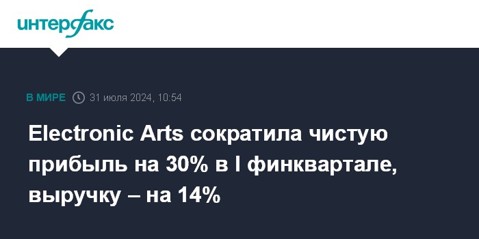 Москва. 31 июля. INTERFAX.RU - Electronic Arts, один из ведущих производителей компьютерных игр в мире, снизил чистую прибыль и выручку в первом финансовом квартале, при этом скорректированная прибыль превысила ожидания рынка, а объем полученных заказов разочаровал инвесторов.