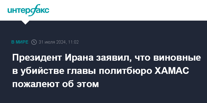 Москва. 31 июля. INTERFAX.RU - Президент Ирана Масуд Пезешкиан в среду заявил, что виновные в убийстве главы политбюро группировки ХАМАС Исмаила Хании пожалеют о содеянном, сообщает агентство "Мехр".
