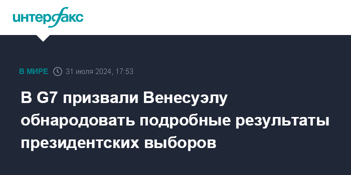 Москва. 31 июля. INTERFAX.RU - Страны "большой семерки" в среду обратились к Каракасу с призывом опубликовать полноценные данные о результатах голосования на президентских выборах, прошедших в Венесуэле в минувшее воскресенье.