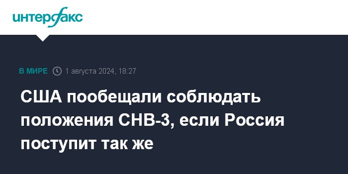 Москва. 1 августа. INTERFAX.RU - Вашингтон планирует и дальше соблюдать основные ограничения, прописанные в СНВ-3, при условии, что Россия также будет следовать его условиям, заявил и.о. помощника министра обороны США Випин Наранг.