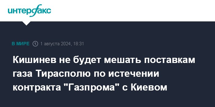 Москва. 1 августа. INTERFAX.RU - Молдавия не будет препятствовать поставкам российского газа в Приднестровье после истечения контракта "Газпрома" с Украиной на транзит газа, который заканчивается 1 января 2025 года, говорится в материалах молдавского Минэнерго о подготовке страны к отопительному сезону. Материалы опубликованы на сайте ведомства для обсуждения.
