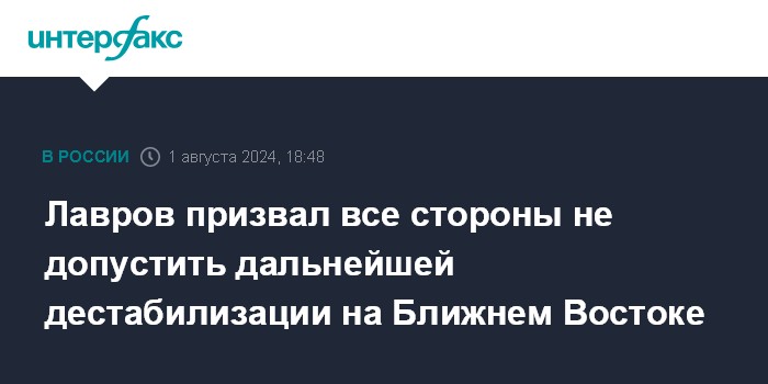 Москва. 1 августа. INTERFAX.RU - Глава МИД России Сергей Лавров призвал все стороны, влияющие на ситуацию на Ближнем Востоке, не допускать действий, которые могут привести к дальнейшей дестабилизации ситуации, сообщили на Смоленской площади.