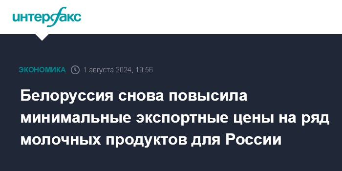 Ранее в 2024 году Минсельхозпрод Белоруссии повышал минимальные цены на молочные продукты на экспорт на российский рынок 18 и 12 июля, 22 июня, 12 и 2 апреля, а также 23 и 8 марта.