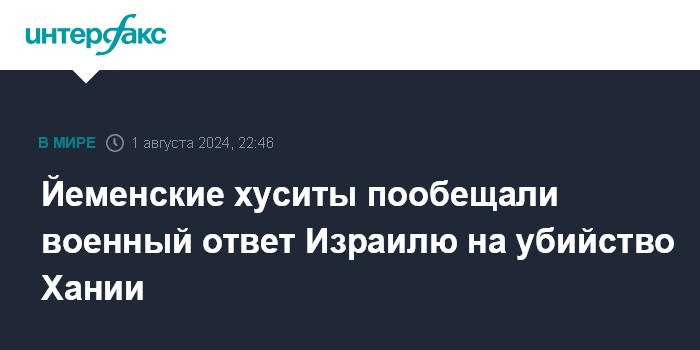 Москва. 1 августа. INTERFAX.RU - Лидер йеменских повстанцев-хуситов Абдельмалек аль-Хуси в четверг пообещал военный ответ Израилю на убийство главы политбюро палестинского движения ХАМАС Исмаила Хании.