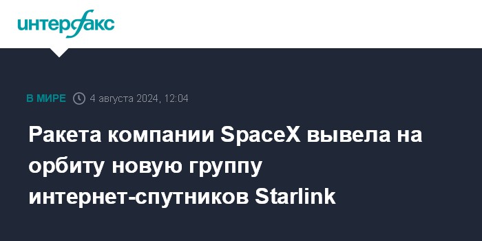 Москва. 4 августа. INTERFAX.RU - Ракета-носитель Falcon 9 в воскресенье вывела на орбиту очередную партию из 23 мини-спутников для пополнения орбитальной группировки глобальной сети интернет-покрытия системы Starlink, сообщила компания-разработчик SpaceX.