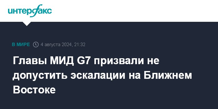 Москва. 4 августа. INTERFAX.RU - Министры иностранных дел стран-членов "Большой семерки" считают необходимым, чтобы все стороны конфликта на Ближнем Востоке проявили сдержанность и не допустили эскалации, сообщил в воскресенье глава МИД Италии Антонио Таяни.
