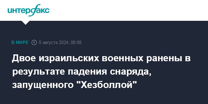 Москва. 5 августа. INTERFAX.RU - Офицер и солдат Армии обороны Израиля (ЦАХАЛ) получили ранения средней тяжести в результате ракетного удара, нанесенного "Хезболлой" по району близ Айелет-ха-Шахар на севере страны.