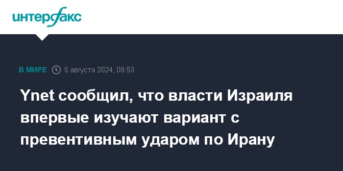 Москва. 5 августа. INTERFAX.RU - Израильские власти в связи с возможностью скорой иранской атаки на Израиль впервые включили в список рассматриваемых сценариев действий превентивный удар по Ирану. Об этом сообщает в понедельник Ynet со ссылкой на неназванных официальных лиц Израиля.