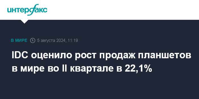 Москва. 5 августа. INTERFAX.RU - Мировые продажи планшетных компьютеров во втором квартале 2024 года подскочили на 22,1% относительно того же периода прошлого года и достигли 34,4 млн штук. Таковы предварительные расчеты исследовательской компании IDC.