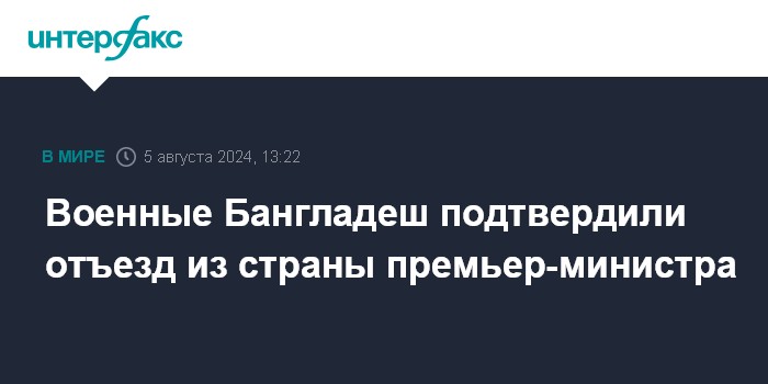 Москва. 5 августа. INTERFAX.RU - Командующий сухопутными войсками Бангладеш генерал Вакер уз-Заман заявил в понедельник, что премьер Шейх Хасина покинула территорию страны.