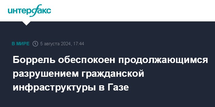 Москва. 5 августа. INTERFAX.RU - Глава дипломатии Евросоюза Жозеп Боррель заявил о серьезной обеспокоенности ЕС продолжающимся разрушением ключевой гражданской инфраструктуры в секторе Газа, включая водоочистную станцию в Рафахе.