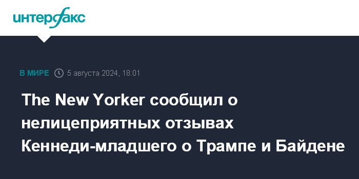 Москва. 5 августа. INTERFAX.RU - Роберт Кеннеди-младший, независимый кандидат в президенты США, критиковал в частных беседах кандидата от республиканцев Дональда Трампа, пишет The New Yorker.