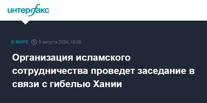 "Организация исламского сотрудничества проведет внеочередное заседание Исполнительного комитета открытого состава на уровне глав МИД для обсуждения преступлений Израиля против палестинского народа, в том числе убийства Исмаила Хании... и агрессии против суверенитета Исламской Республики Иран", - сказано в сообщении.