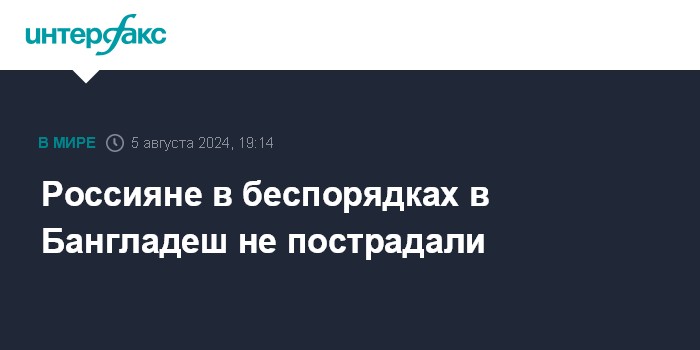 Москва. 5 августа. INTERFAX.RU - Российский МИД прокомментировал происходящее в Бангладеш, по информации министерства, которое сослалось на посольство России в Дакке, россияне из-за беспорядков в этой стране не пострадали, ситуацию взяли под контроль военные.