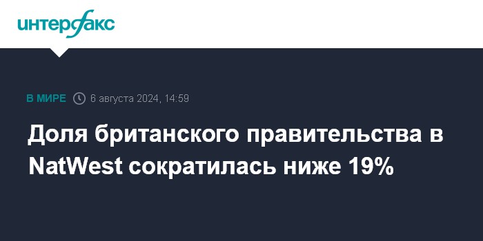 Москва. 6 августа. INTERFAX.RU - Правительство Великобритании за счет продажи акций NatWest (бывший Royal Bank of Scotland) сократило свою долю в банке до 18,99% с 19,97%. Британский Минфин сообщил, что 2 августа продал 83,9 млн акций банка.