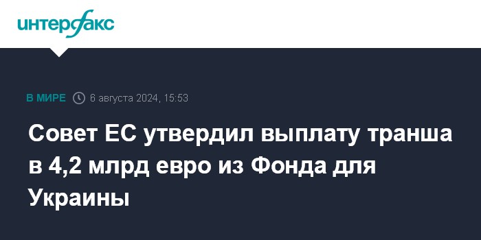 Москва. 6 августа. INTERFAX.RU - Совет ЕС утвердил первую регулярную выплату грантов и кредитов в почти 4,2 млрд евро из Фонда для Украины, сообщается в коммюнике.