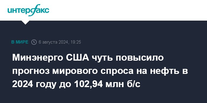 Москва. 6 августа. INTERFAX.RU - Минэнерго США чуть повысило прогноз мирового спроса на нефть в 2024 году с 102,91 млн баррелей в сутки (б/с) до 102,94 млн б/с, а прогноз на 2025 год понижен на 130 тыс. б/с, говорится в ежемесячном отчете управления энергетической информации Минэнерго США (EIA).