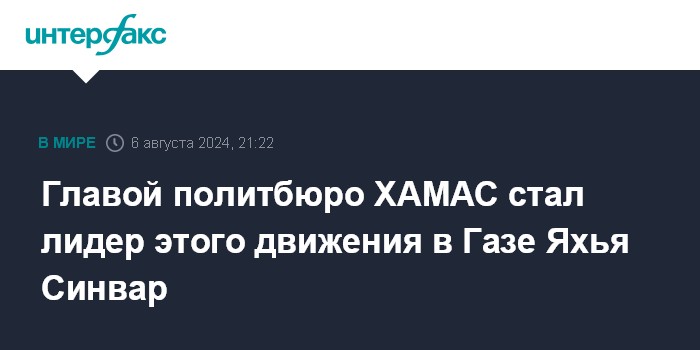 Москва. 6 августа. INTERFAX.RU - Главой политбюро ХАМАС назначен лидер этого палестинского движения в секторе Газа Яхья Синвар, сообщают во вторник вечером арабские СМИ.