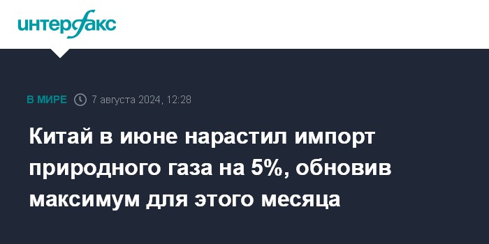 Москва. 7 августа. INTERFAX.RU - Китай в июне нарастил импорт природного газа на 5%. Поставки трубопроводного газа и СПГ росли примерно одинаковыми темпами, обновляя статистические максимумы для соответствующего месяца года.