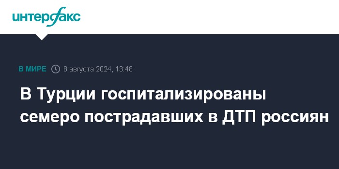 Москва. 8 августа. INTERFAX.RU - Пострадавшие утром в четверг в ДТП в Турции россияне застрахованы в компании "Евроинс", семеро из них госпитализированы с травмами, в том числе одна - в тяжелом состоянии, сообщила "Интерфаксу" замгенерального директора СК "Евроинс" Юлия Алчеева.